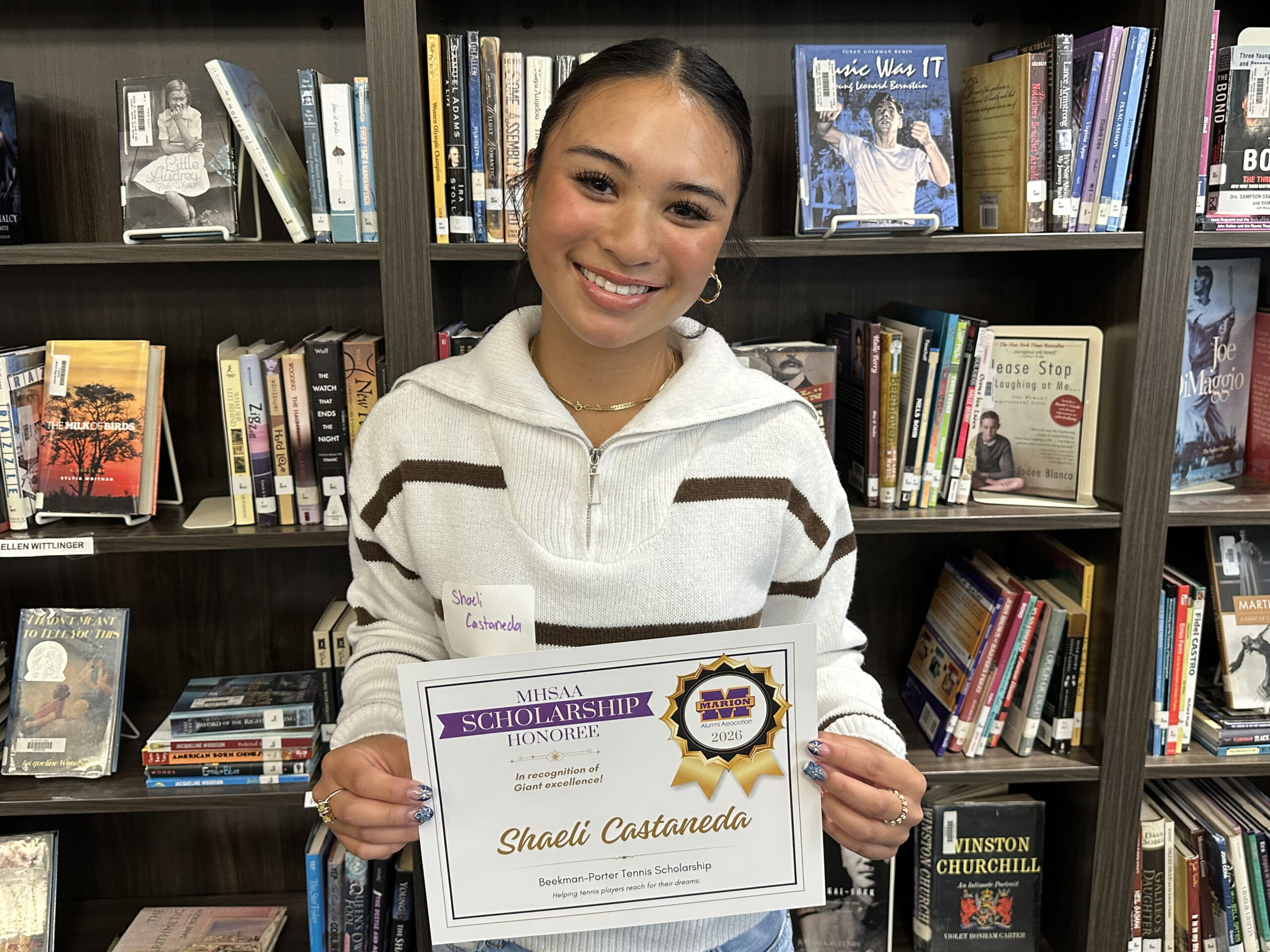 Shaeli is a 2026 recipient of several scholarships facilitated by the Marion High School Alumni Association: the Jack and Dave Colescott Scholarship, the Marion Giants Athletic Boosters Scholarship, the Beekman-Porter Tennis Scholarship, and the Keller Family Science Scholarship, for a total award of $3,050.