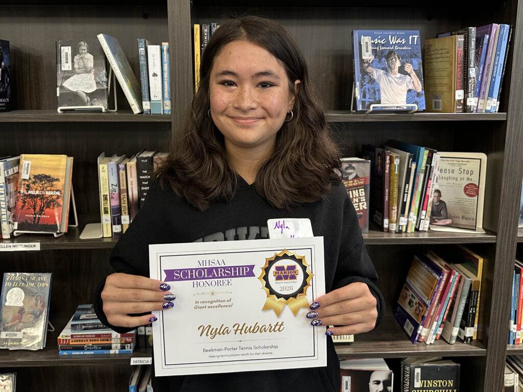 Nyla is a 2026 recipient of two scholarships facilitated by the Marion High School Alumni Association: the Beekman-Porter Tennis Scholarship, and the Marion Giants Athletic Boosters Scholarship, for a total award of $650.