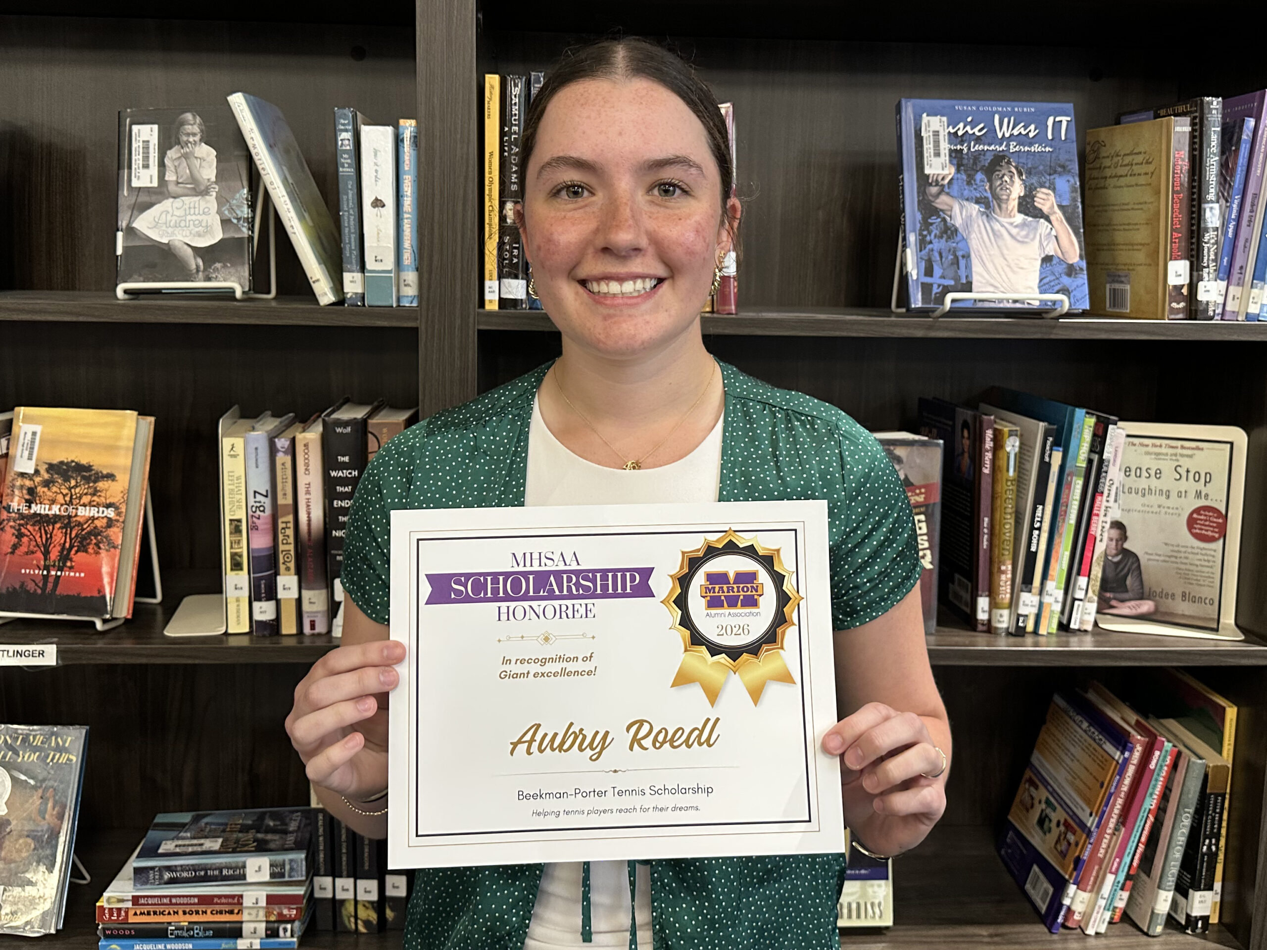 Aubry is a 2026 recipient of three scholarships facilitated by the Marion High School Alumni Association: the Beekman-Porter Tennis Scholarship, the Jason Taylor Family Scholarship, and the Keller Family Science Scholarship, for a total award of $3,000.