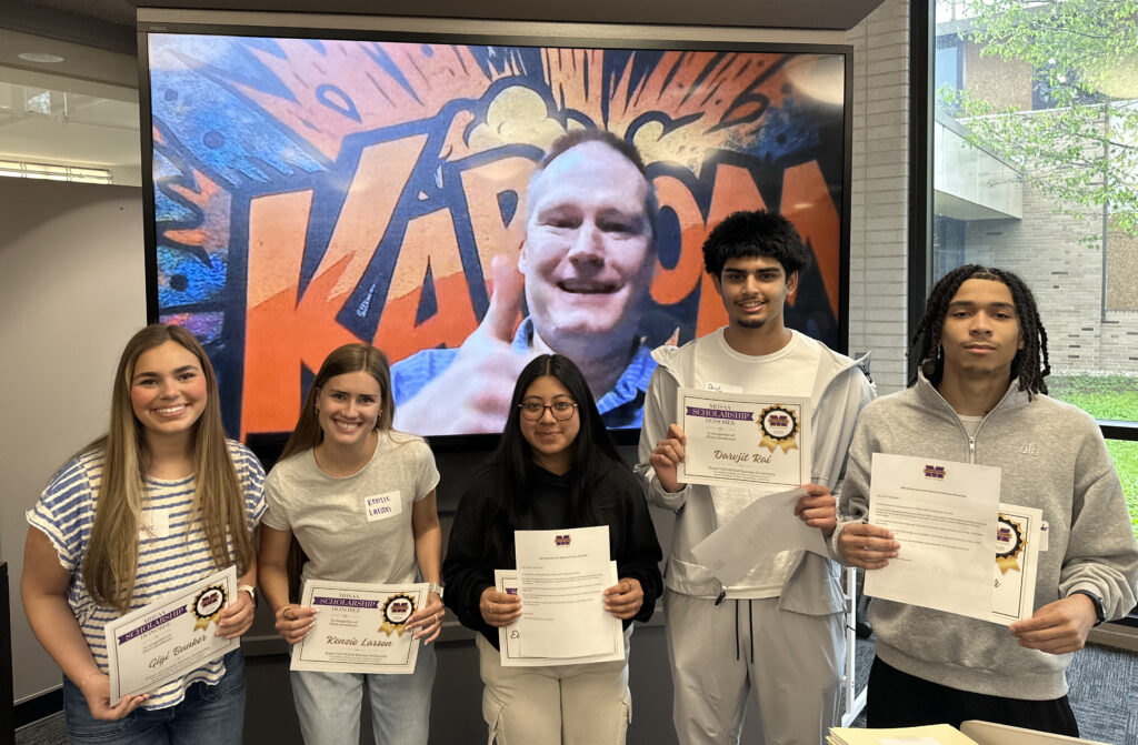 With alumnus Robert Hull attending virtually from afar, from left are 2026 Robert Hull Business Scholarship winners Gigi Bunker, Kenzie Larson, Evelynn Lopez-Gomez, Darvjit Rai, and Jace Freshwater.