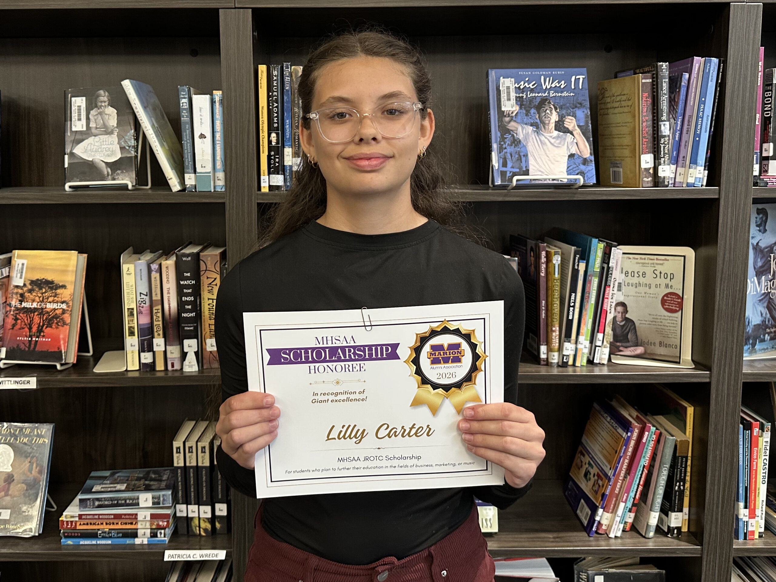 Lilly is also a 2026 recipient of two scholarships facilitated by the Marion High School Alumni Association: the Jason Taylor Family Scholarship, and the JROTC Scholarship. She was also selected for a Grant County Sports Hall of Fame scholarship, which was announced during the MHSAA’s scholarship awards. Her total award is $5,500.