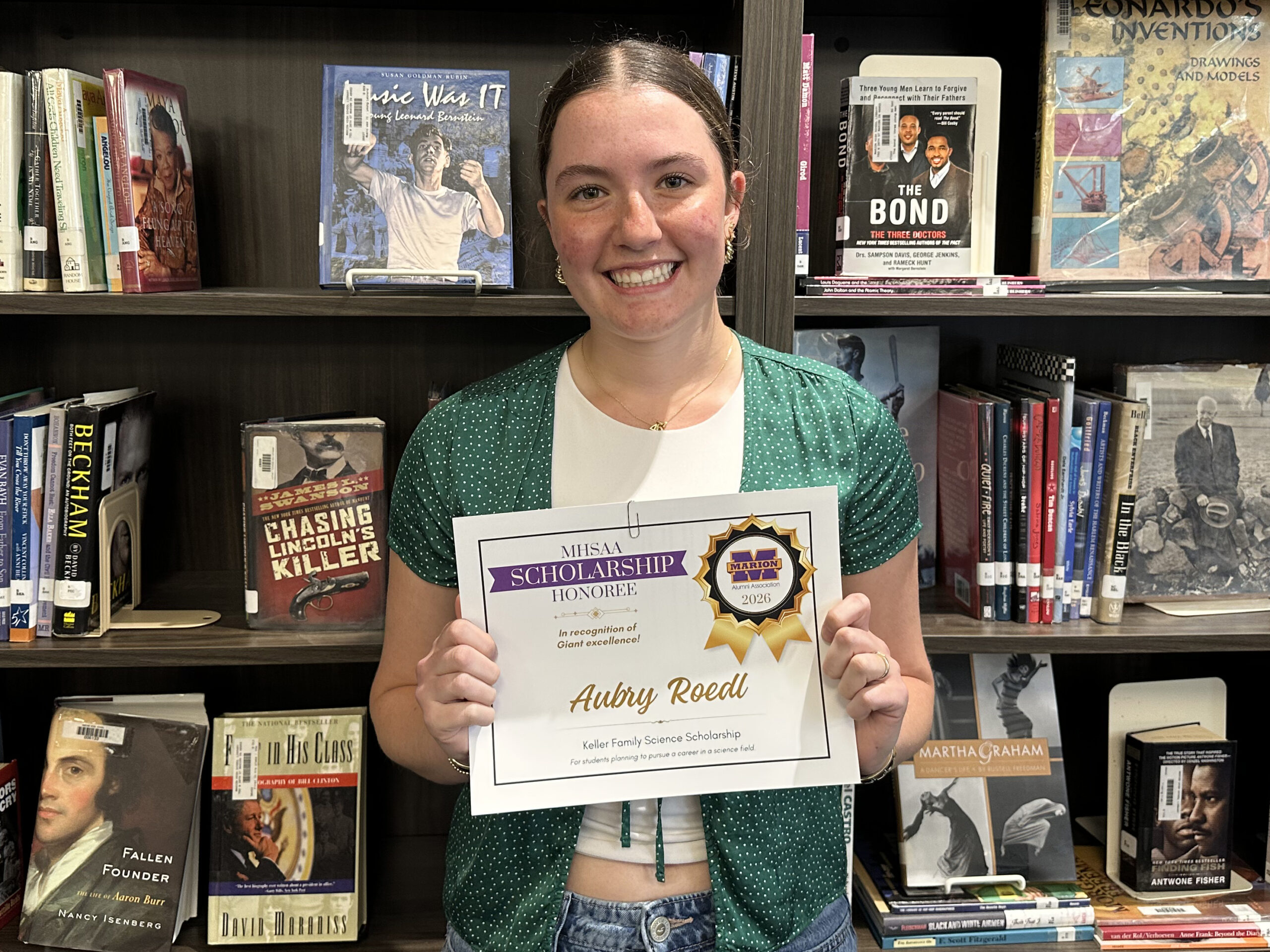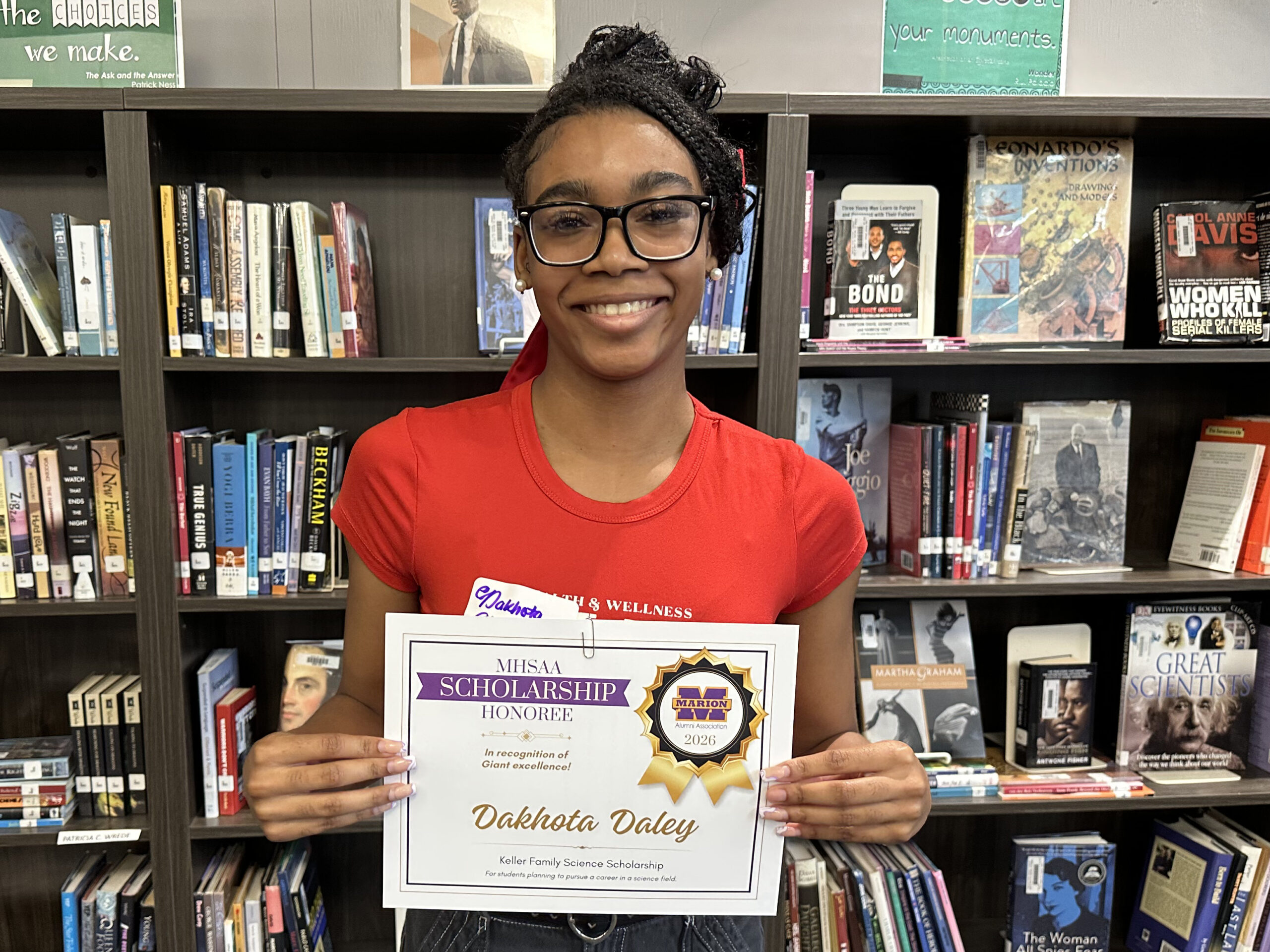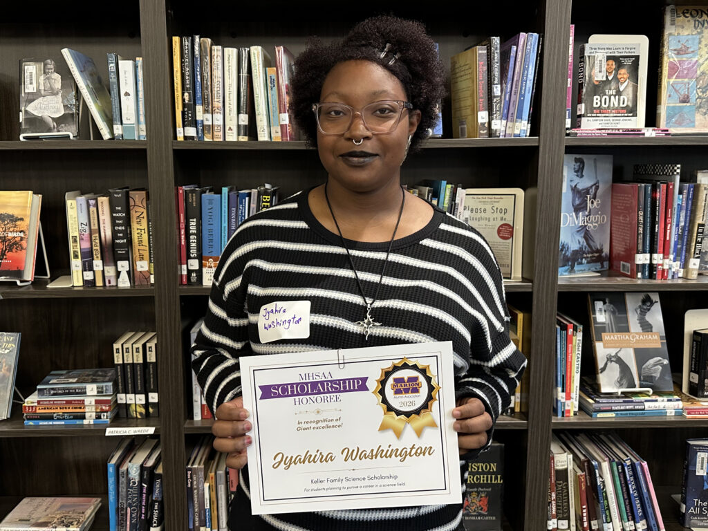 Dakhota is a 2026 recipient of two scholarships facilitated by the Marion High School Alumni Association: the Keller Family Science Scholarship, and the Marion Giants Athletic Boosters Scholarship. She was also selected for a James Blackmon Family Scholarship, which was announced during the MHSAA’s scholarship awards. Her total award is $1,450.
