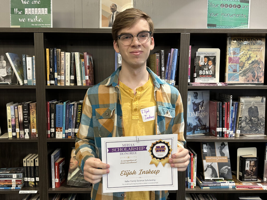 Elijah is a 2026 recipient of two scholarships facilitated by the Marion High School Alumni Association: the F. Ritchie Walton Scholarship, and the Keller Family Science Scholarship, for a total award of $700.