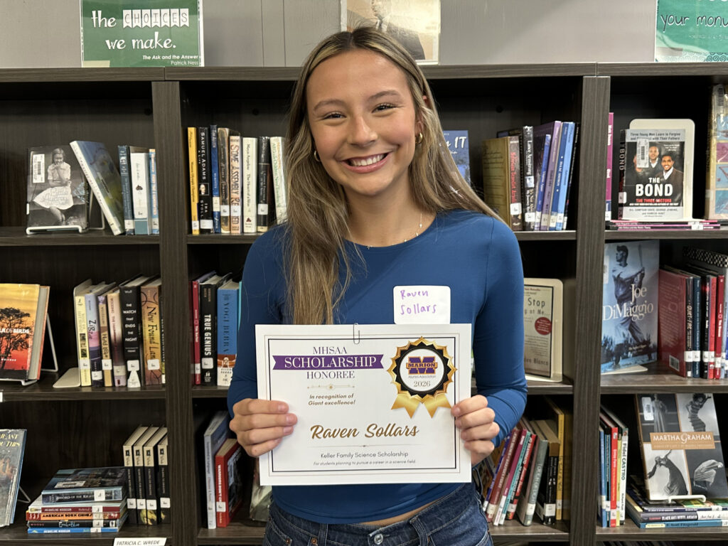 Raven is a 2026 recipient of two scholarships facilitated by the Marion High School Alumni Association: the Keller Family Science Scholarship, and the Marion Giants Athletic Boosters Scholarship, for a total award of $700.