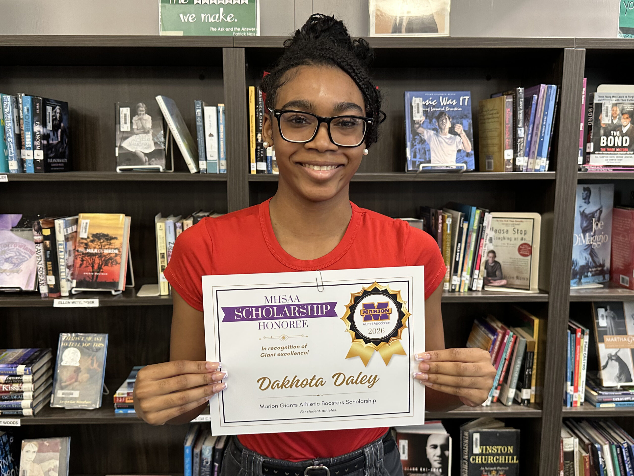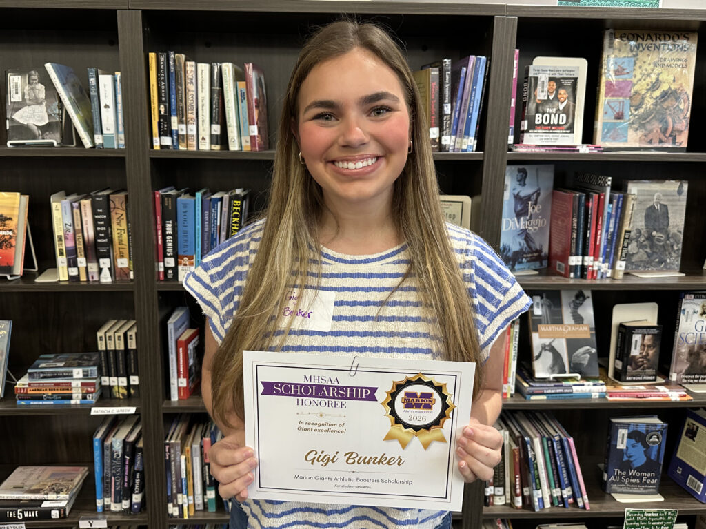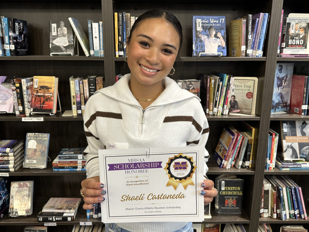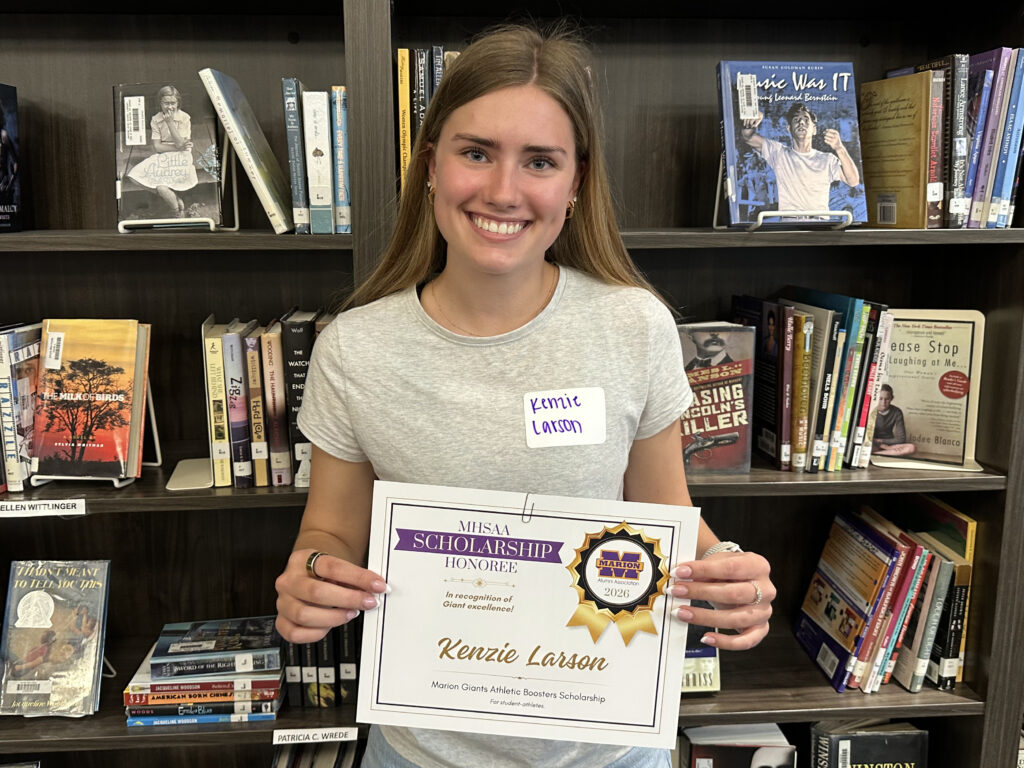 Dakhota is a 2026 recipient of two scholarships facilitated by the Marion High School Alumni Association: the Keller Family Science Scholarship, and the Marion Giants Athletic Boosters Scholarship. She was also selected for a James Blackmon Family Scholarship, which was announced during the MHSAA’s scholarship awards. Her total award is $1,450.