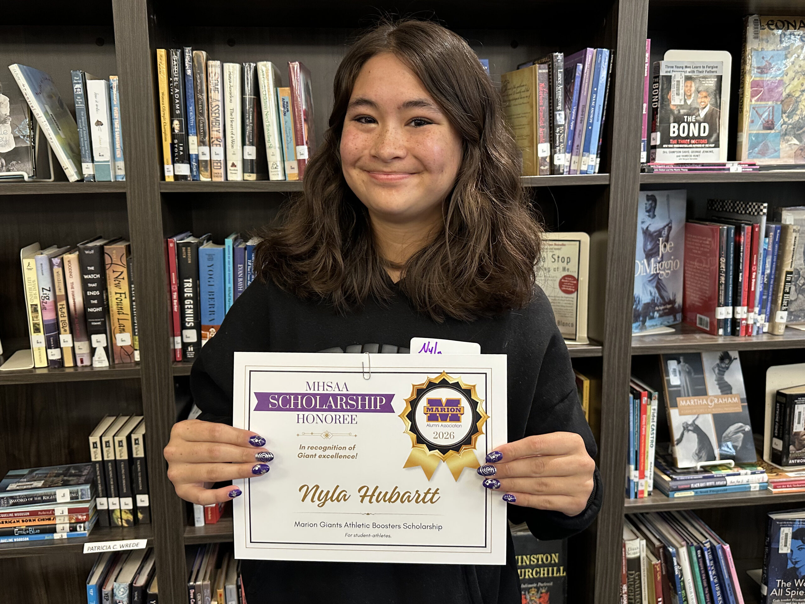 Nyla is a 2026 recipient of two scholarships facilitated by the Marion High School Alumni Association: the Beekman-Porter Tennis Scholarship, and the Marion Giants Athletic Boosters Scholarship, for a total award of $650.