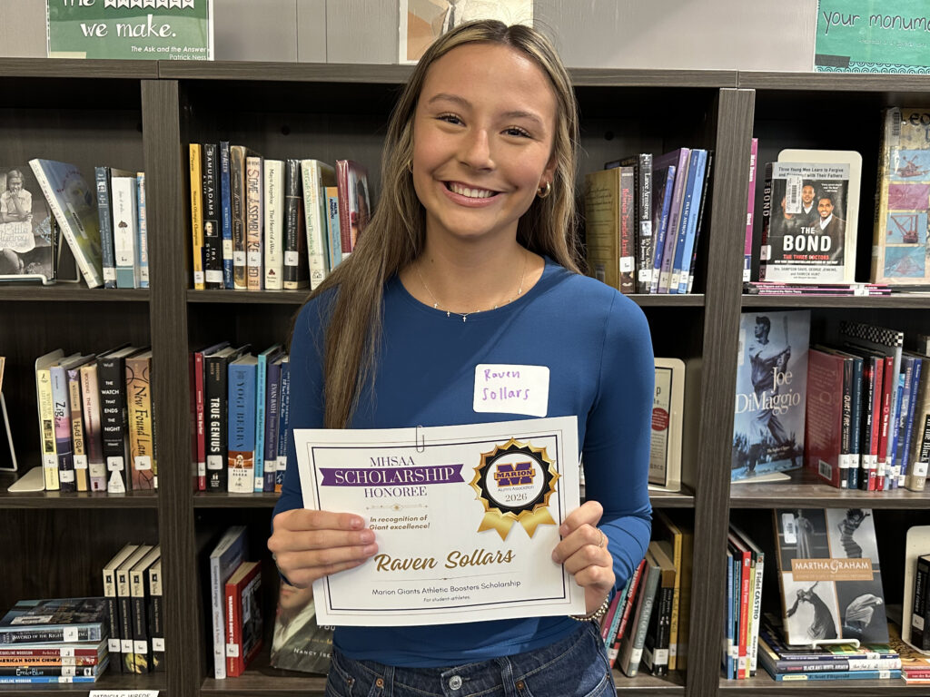 Raven is a 2026 recipient of two scholarships facilitated by the Marion High School Alumni Association: the Keller Family Science Scholarship, and the Marion Giants Athletic Boosters Scholarship, for a total award of $700.